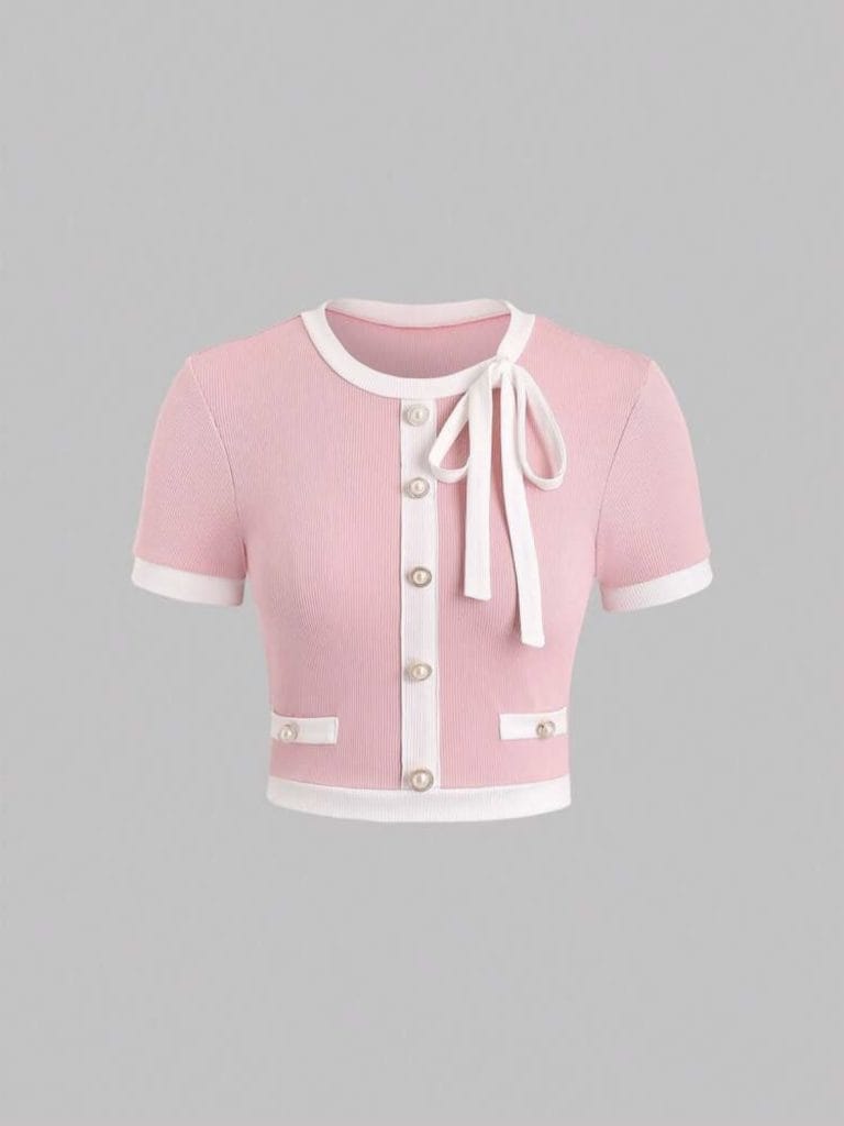 Sweetra T-shirt moulant avec détails de bouton de reliure de contraste pour les t-shirts graphiques d’été décontractés pour femmes