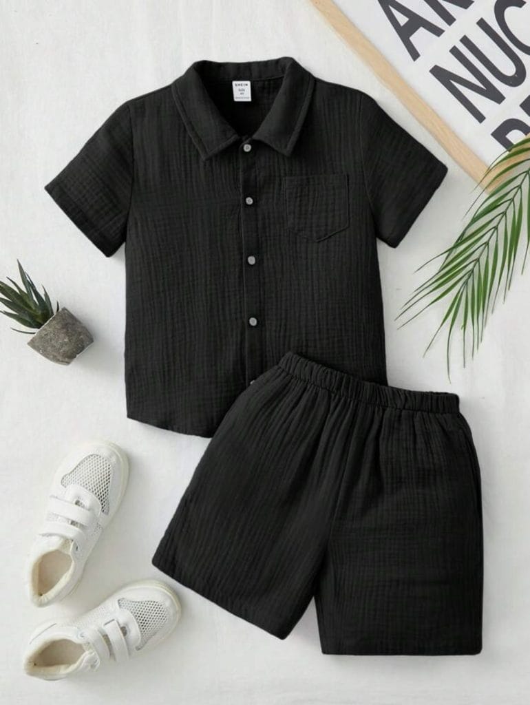 SHEIN Ensemble chemise et short unicolore pour jeune garçon avec poche appliquée, tenue simple pour pré-adolescents