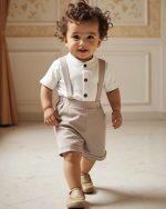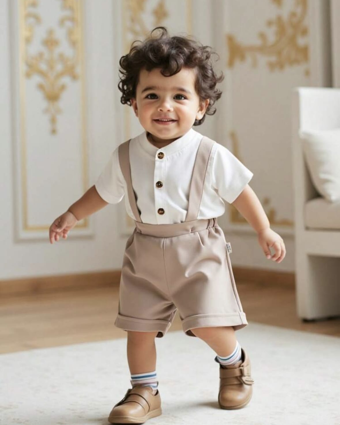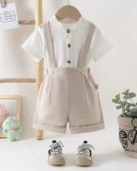 2 pièces Ensemble chemise à col montant et short salopette pour bébé garçon. Mode, doux et confortable, adapté aux tenues d’été, vêtements d’enfant, vêtements de tout-petit, tenue de bébé, tenues pour bébé garçon, chemise de bébé, salopette short de tout-petit, 6 mois – 3 ans