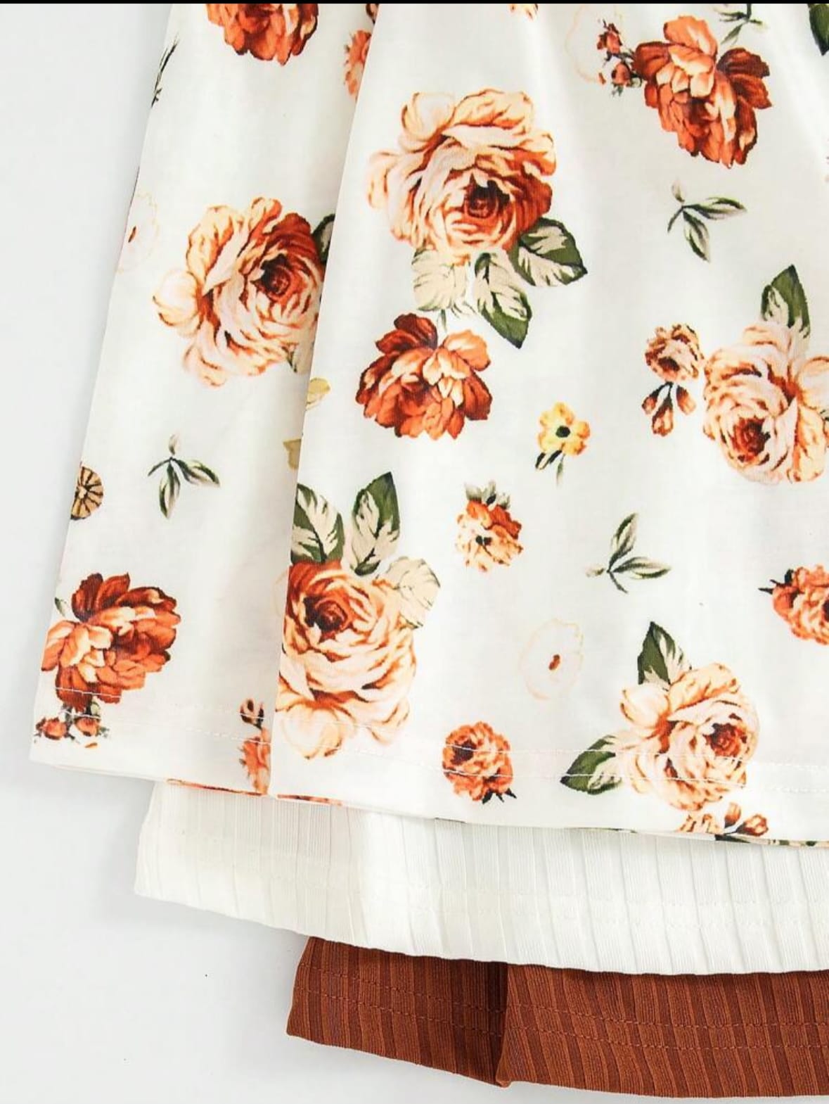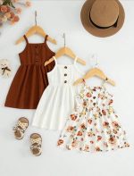 3 pièces Ensemble robe à bretelles boutonnées côtelées de bébé fille avec imprimé floral et unicolore