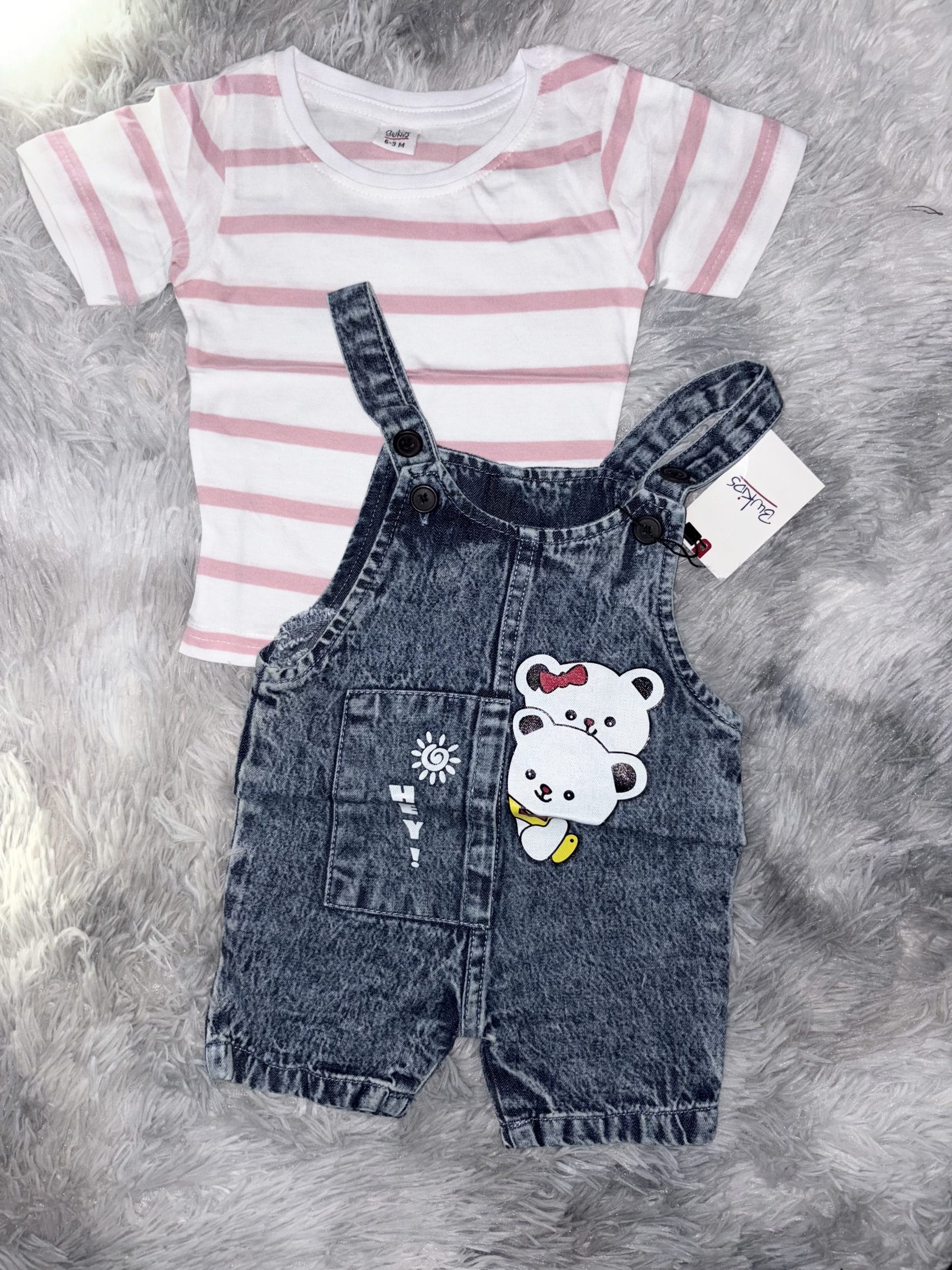 Jolie salopette jean ourson avec t-shirt rose