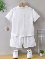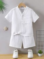 SHEIN 2 pièces Ensemble Jeune Garçon Mode Casual Confortable Simple Pratique Polyvalent Matériau Lin Doux Chemise Manches Mi-Longues et Short, Respirant et Confortable pour Printemps/Été
