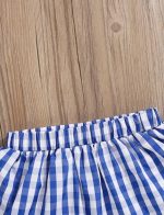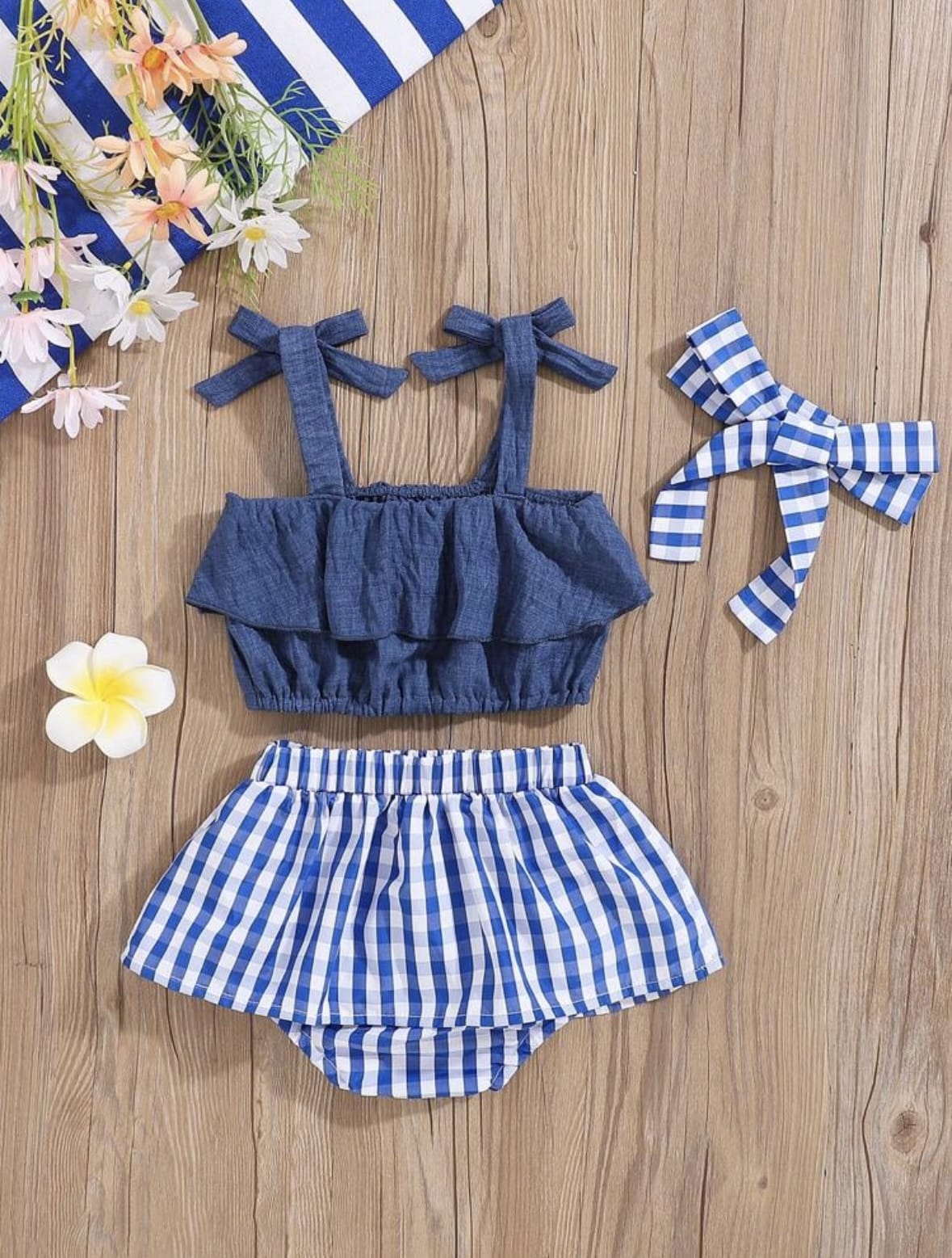 SHEIN 3 pièces Ensemble de top de camisole denœud papillon adorable pour bébé fille, jupe à carreaux avec ourlet à froufrous et bandeau pour fête de vacances d’été