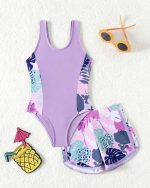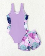 SHEIN Maillot De Bain Une Pièce Imprimé Tropical Pour Jeunes Filles Avec 2 Pièces/ensemble De Shorts De Bain